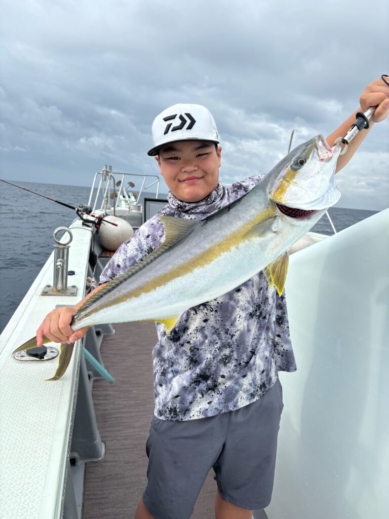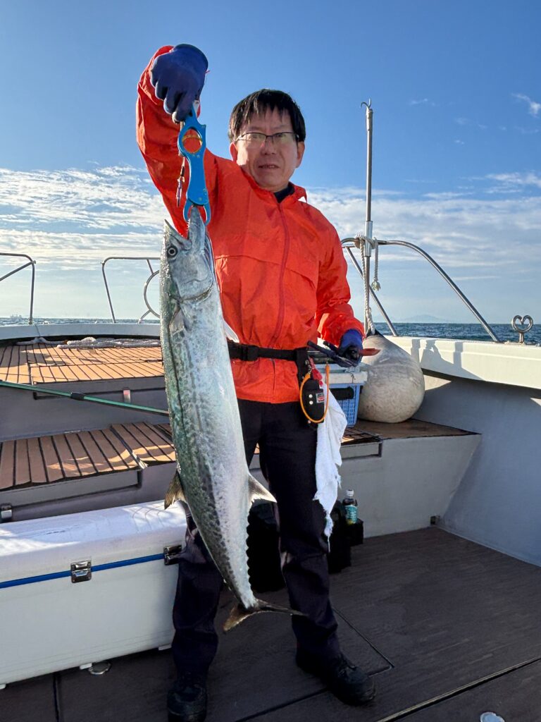 /釣りのポイントに到着すると、さっそく仕掛けを投入。最初はなかなかアタリが来なかったものの、徐々に魚の活性が上がり、ブリやヒラマサなど思わぬ大物もヒット!お客様の歓声が船上に響き渡り、まるで子どもに戻ったような笑顔があふれていました。